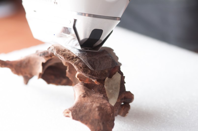 Análisis químico elemental con fluorescencia de rayos X portátil in situ de un hueso del maxilar superior de una momia chinchorro con recubrimiento pintado. Foto: Manuel Alarcón / MNHN.