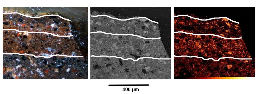 Esta es una imagen por microscopía de corte transversal de una muestra de recubrimiento de una momia Chinchorro tomada por Marcela Sepúlveda en 2015. Foto: Museo Nacional de HIstoria Natural Chile.