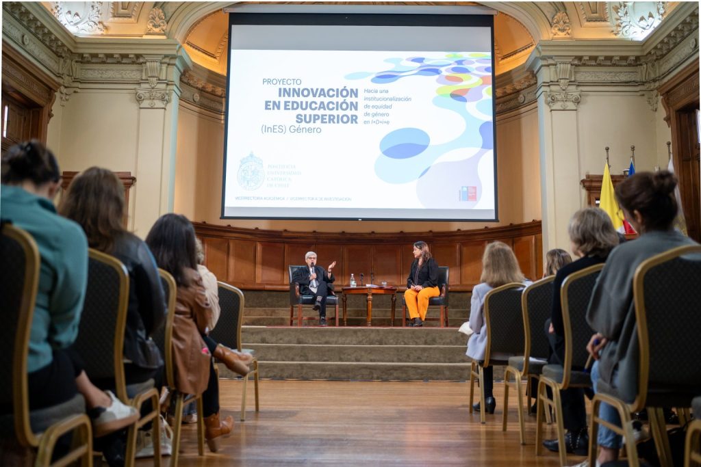 En la universidad “contamos con avances significativos en el desafío de incorporar la equidad de género en los ámbitos de I+D+i+e”, dijo la directora alterna de InES Género -en la universidad- y directora de Desarrollo Académico y de Equidad de Género, Silvana Zanlungo, quien dio como ejemplo la adjudicación, en 2021, de dicho proyecto, y la creación reciente de recomendaciones de corresponsabilidad y disminución de la brecha de género en la academia.