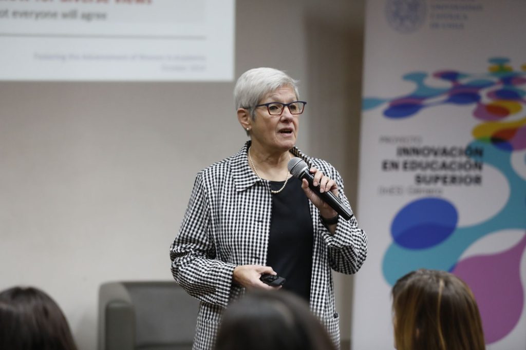¿El contexto? Realizar dos charlas magistrales, en los campus Casa Central y en San Joaquín: la primera de ellas -el 9 de octubre- fue pensada para las autoridades de la Universidad Católica y la segunda -el 10 de ese mes- estuvo enfocada en la comunidad UC, representantes de los proyectos InES Género a nivel país y AMA, la Alianza Universitaria Chilena para las Mujeres en la Academia.