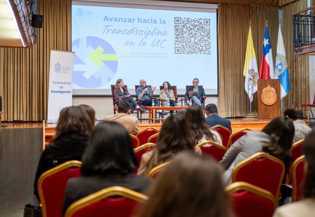 Luego, el académico moderó un panel de conversación integrado por tres integrantes de la Comisión de Transdisciplina UC: Domingo Mery, profesor del Departamento de Ciencias de la Computación de Ingeniería UC; Caroline Stamm del Instituto de Estudios Urbanos y Territoriales, de la Facultad de Arquitectura, Diseño y Estudios Urbanos, y Rosanna Ginocchio, profesora de Agronomía en la universidad. El evento fue altamente participativo y las preguntas del público contribuyeron a ir delineando intuiciones e identificando desafíos futuros para la transdisciplina en la UC.